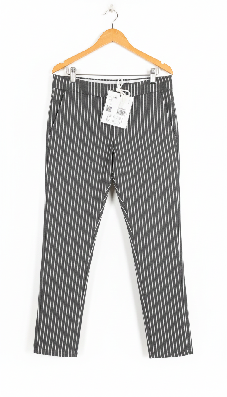These are beige trousers featuring thin vertical black pinstripes. They have a slim/straight fit with side pockets and a comfortable elastic-style waistband. The design makes them suitable for both casual and semi-formal outfits.