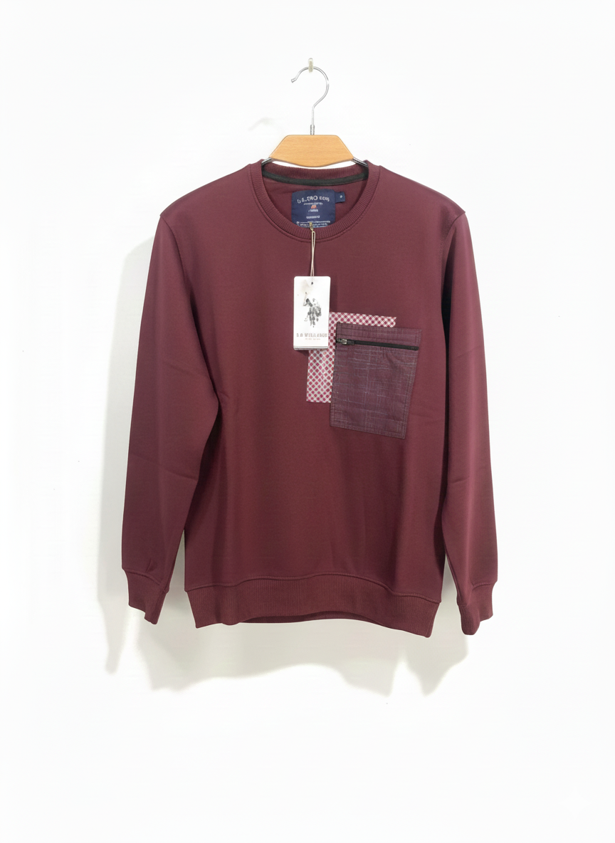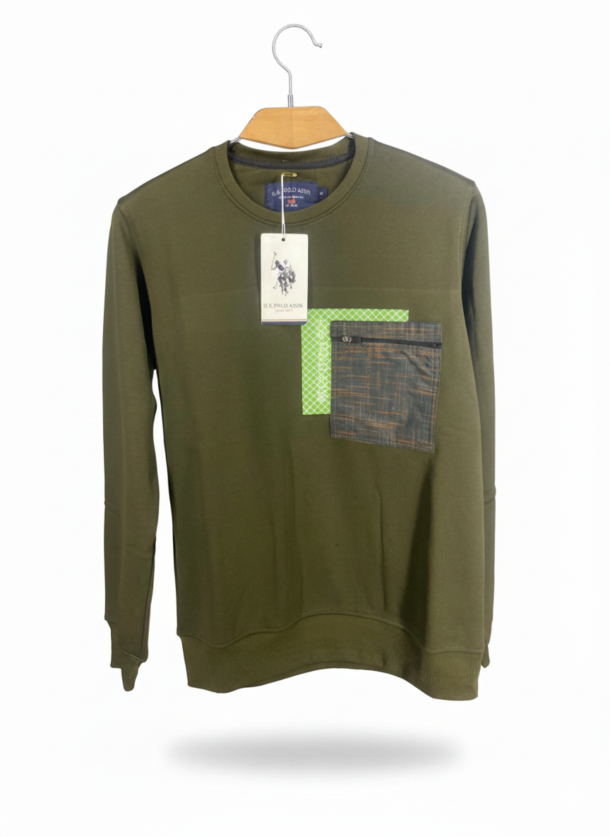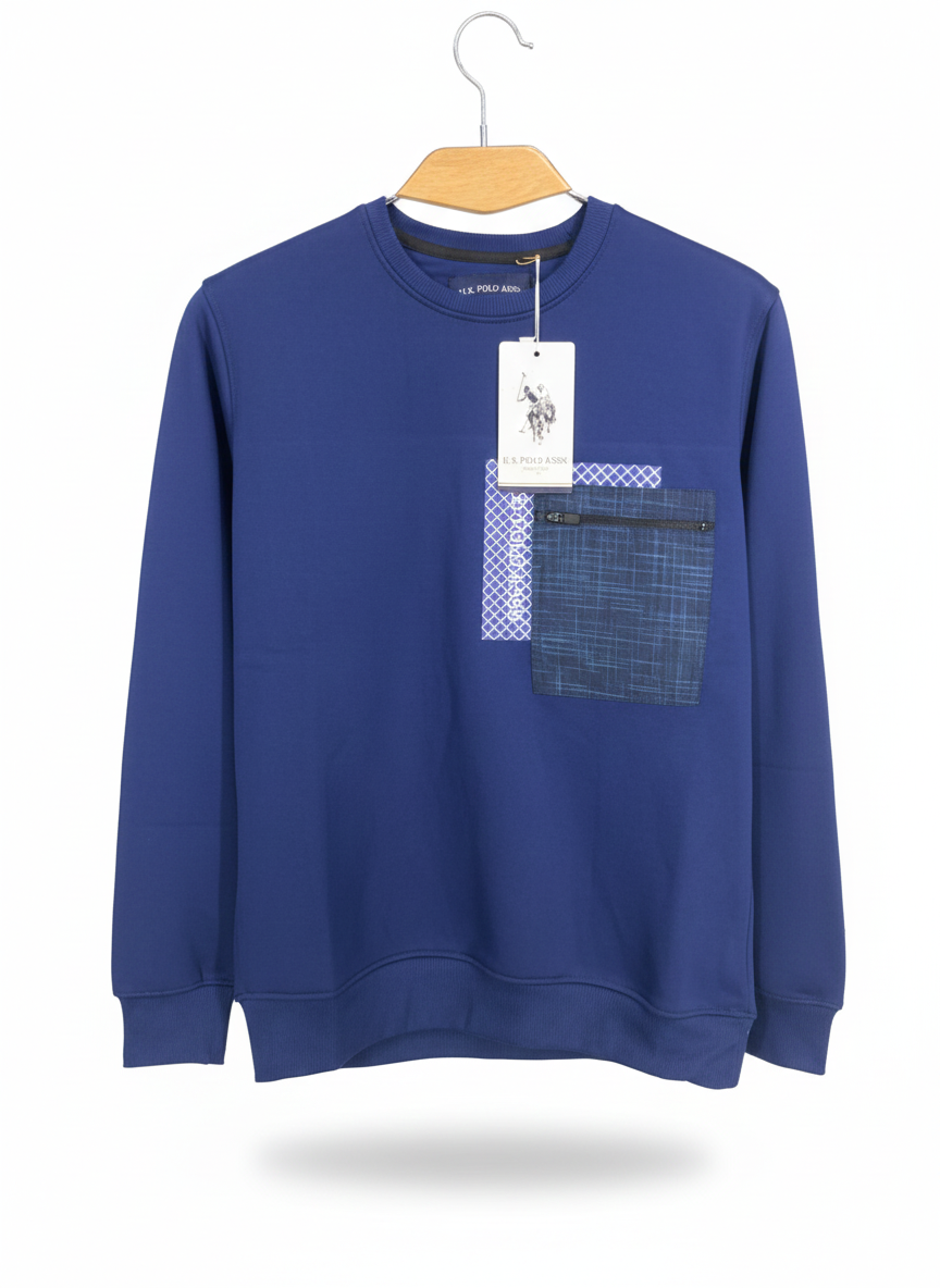 This modern crew neck sweatshirt comes in a deep navy blue color, offering a clean and stylish look. The standout feature is the contrasting graphic chest pocket, designed with a textured blue pattern and a small zipper, adding both function and visual appeal. Beside the pocket, a geometric white print enhances the overall contemporary design.